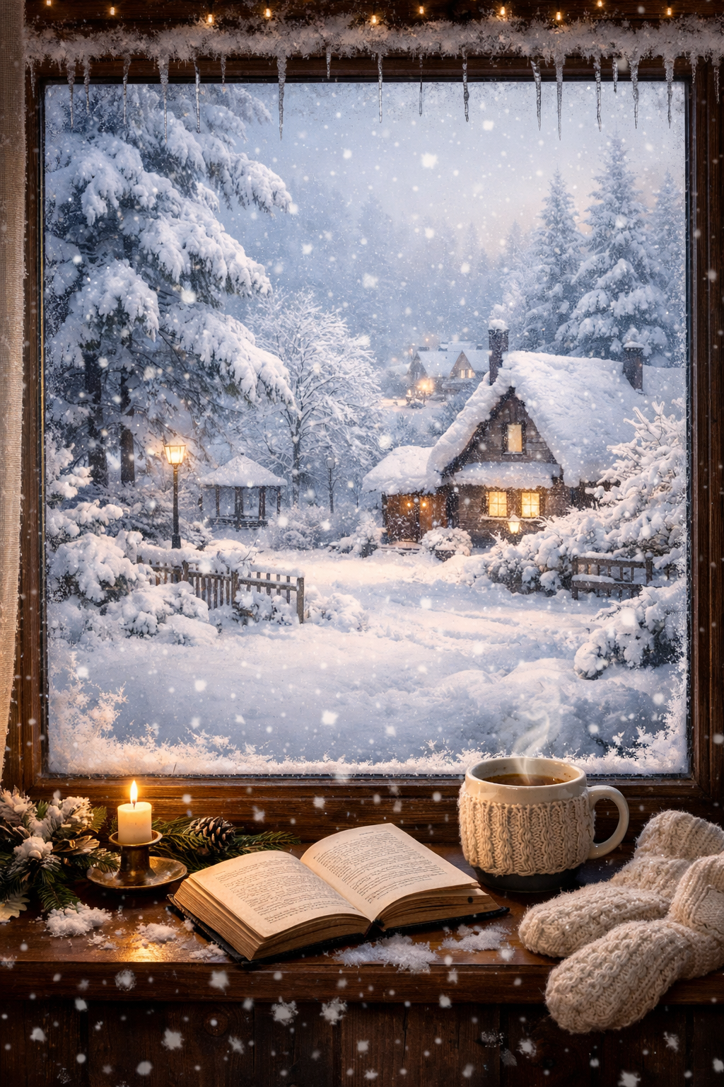 За склом, панує кришталево чистий, казковий хаос. Сніжинки танцюють свій безмовний вальс, перетворюючи знайомий двір на невідомий, чарівний ландшафт. Дерева вбралися у білосніжні шати, і навіть звичні дахи виглядають величними.