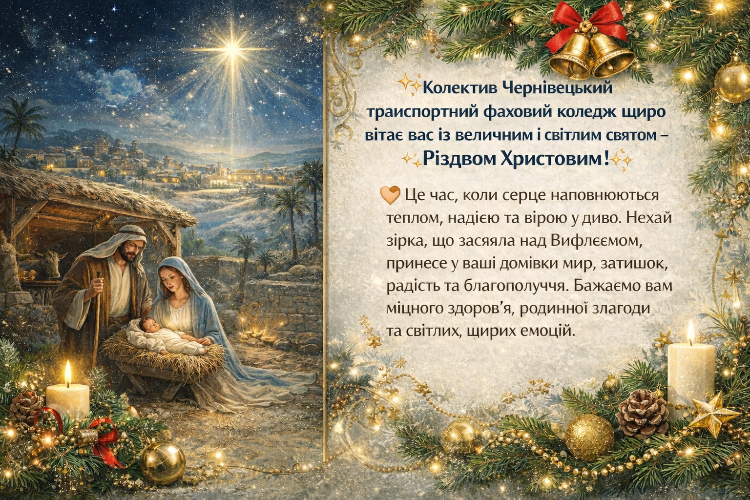 Різдвяне світло єднає серця: вітання від Чернівецького транспортного фахового коледжу